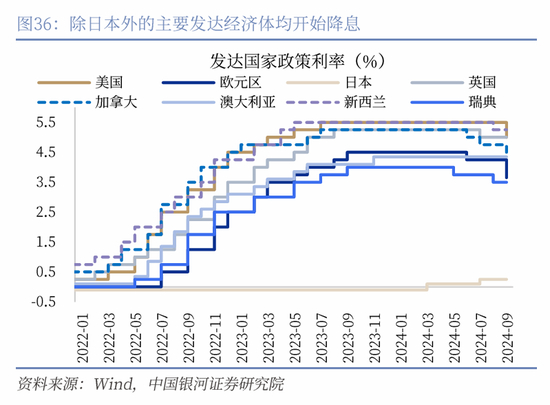 一是美联储降息周期开启为我国强化逆周期政策提供了契机。美联储在9月FOMC会议上宣布降息50BP,降息后利率水平为4.75%-5.00%,正式进入降息周期。根据美联储点阵图显示,4季度到明年年底的降息幅度在200基点以上。从美联储的双重目标以及经济增长、金融稳定和大选与财政等角度来看,美联储“预防性”降息的基调短期仍将持续,美国经济大概率走向软着陆或者浅衰退。目前,除了日本央行之外,主要发达经济体央行的货币政策都进入了降息周期,这为中国货币宽松提供友好的“顺风”环境。虽然这并不是决定性因素,但也很大程度上拓宽了国内政策的空间,为实施更为宽松的货币政策和积极的财政政策提供了条件。因此 9月份政治局会议上提出 “要降低存款准备金率,实施有力度的降息”,可以被理解为货币政策空间已经完全打开,将为后续财政政策出台提供流动性环境。