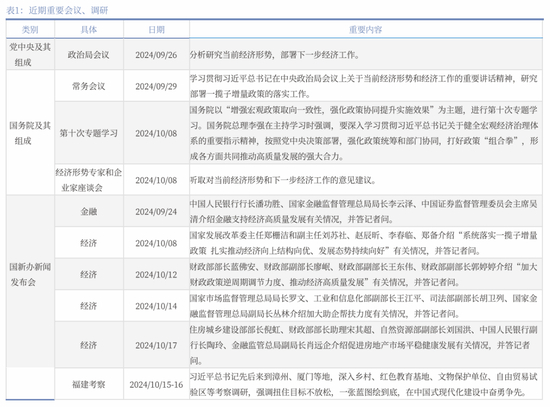 第一,当下一揽子政策是中央层面自上而下一次系统部署。9月26日,总书记主持召开政治局会议,亲自部署下一步经济工作,拉开本轮史诗级宏观调控的号角。围绕加大宏观政策逆周期调节、扩大国内有效需求、加大助企帮扶力度、推动房地产市场止跌回稳、提振资本市场等五个方面,系统部署一揽子增量政策。一般情况下经济工作并不是9月政治局会议的主要议题,本次9月政治局会议超常规召开并重点讨论当下经济形势已经说明了当局稳增长的决心。9月29日,国务院总理李强主持召开国常会,研究部署一揽子增量政策的落实工作。之后,一系列重磅发布会频频亮相,一系列增量政策加快出台。其政策出发点是全面贯彻落实9.26政治局会议精神,加快落实一揽子增量政策的具体部署。10月8日,发改委系统介绍落实一揽子增量政策有关情况。10月12日,财政部介绍加大财政政策逆周期调节力度相关情况,增量财政将重点支持地方化债、国有大型商业银行补充核心一级资本、推动房地产市场止跌回稳等多方面。10月14日,国家市场监督管理总局等四部门介绍加大助企帮扶力度有关情况。10月17日,住建部等五部门介绍促进房地产市场平稳健康发展有关情况。此外,9月24日,“一行一局一会”已推出一揽子金融政策,包括降准、降息、降存量房贷利率、降首付比例、创设两项用于支持资本市场稳定发展的工具等,力度超出市场预期,着力稳经济、稳就业、稳市场、稳预期。此外,近期党中央、国务院领导悉数赴地方调研,加快督导政策落实,推动经济持续回升向好,努力完成全年经济社会发展目标任务。