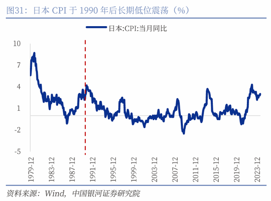 泡沫破灭后,企业和个人面临资产负债表的严重失衡。由于资产价格的迅速下跌,很多企业发现自己的资产价值不再足以覆盖原有的债务,企业和个人不得不优先偿还债务,而不是进行新的投资或消费,为了偿债,企业纷纷出售资产,进一步压低了资产价格,形成了所谓的“资产负债表衰退”,房地产和股市陷入长期低迷。随着资产价格下跌和企业削减开支,需求不足的问题逐渐显现,物价水平不断走低,形成了通缩压力。物价持续下跌进一步加剧了企业的偿债负担,因为实际债务负担在通缩环境中上升,企业和个人的支出进一步收缩,形成了恶性循环。从杠杆率来看,90年代中后期,居民和非金融企业部门的杠杆率上升速度明显放缓,也就是说居民和企业加杠杆的动力已经非常弱了,并且后续逐步进入去杠杆阶段,其中居民部门杠杆率从最高70%降至最低60%,企业部门杠杆率从最高140%降至最低100%。