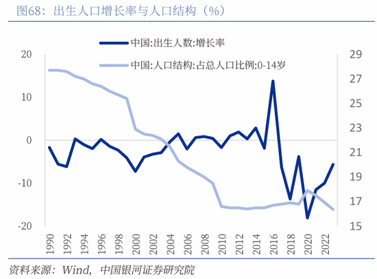 人口老龄化趋势也是制约居民财富继续涌入房地产的重要制约因素。2017年开始,中国出生人数的增长率出现明显下滑。从人口结构来看,0-14岁的人口占比在2000年至2010年的10年间出现比较快速的下行,之后保持在16%左右的水平。人口老龄化将带来房地产需求出现下降。