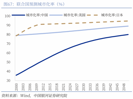 人口老龄化、城镇化的放缓意味着房地产成为核心资产配置的拐点已经出现。从中长期维度来看,考虑到人口结构、城镇化速度等因素的影响,房地产做为核心资产配置的拐点已经出现。根据联合国预测,中国未来20年城镇化的推进速度将减慢。根据央行调查统计司公布的《2019年中国城镇居民家庭资产负债情况调查》,中国城镇居民家庭的住房拥有率为96.0%,从国际比较来看,位于相对较高的水平。有一套住房的家庭占比为58.4%,有两套住房的占比为31.0%,有三套及以上住房的占比为10.5%,户均拥有住房1.5套。美国住户总体的住房拥有率为63.7%,低于我国32.3个百分点。
