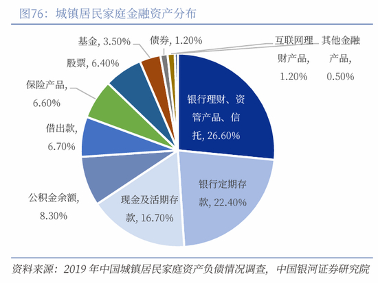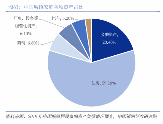 过去相当长时间,房价持续上涨导致中国家庭部门形成对房地产投资的过度偏好,居民资产负债表中高达60-70%的房地产占比显著高于全球平均水平。在未来经济转型过程中,房价很难复制过去那种系统性上涨,除了核心城市、核心地段的优质房地产可以维持其投资属性之外,大部分房产将逐步回归居住属性。房地产投资属性的下降将推动中国居民部门的财富的再平衡,而配置股票、基金、保险、理财等为主的金融资产资本市场将是主要方向。