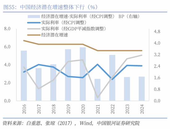 一是房地产市场的拖累作用正在逐步放大。2021年底以来,房地产市场已经连续快速向下调整了将近3年时间,2024年9月的商品房销售面积(季调、折年)已经下降至2010年的水平。一方面,我们可喜地看到高质量发展扎实推进,在房地产开发投资增速几乎连续三年两位数负增长的情况下,GDP增速依然能稳定在5%附近。我们根据投入产出表进行分析,2020年房地产及其上下游行业在GDP中的比重约为23.5%,但2023年已经下降至16.4%,实际经济增长似乎实现了对于房地产的脱敏。