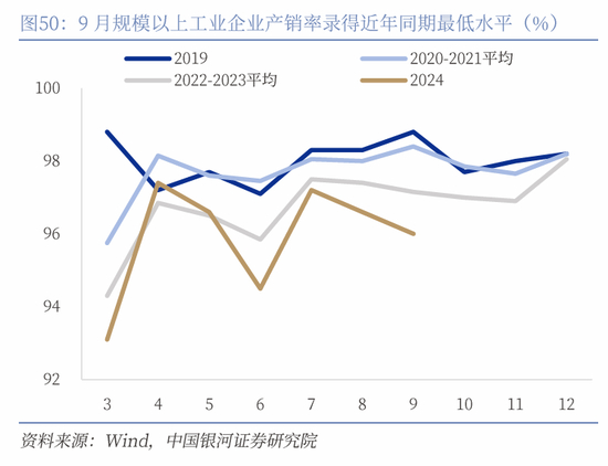 三是更加重视供给的政策导向致使产能利用率偏低。9月份工业增加值增速为5.4%,同期社会消费品零售总额的增速为3.2%,固定资产投资增速仅为3.4%。三季度工业企业产能利用率依然偏低,9月规模以上工业企业产销率录得近年同期最低水平,企业仍存在一定程度的冗余产能。