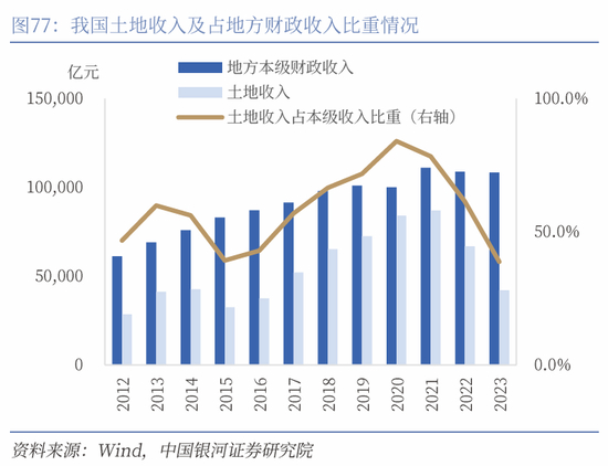 二是地产持续低迷下土地收入大幅降低,广义财政收支平衡突破临界点。自2021年房地产市场调整以来,地方土地出让收入持续大幅降低,至2023年底总收入规模已降至5.8万亿元,较2021年降低约33%。而过去长期发行,用于项目建设的专项债券和部分城投配套融资主要依靠土地收入偿还。自2023年开始全国土地收入规模已经低于地方专项债和狭义城投债务的到期偿还规模。广义财政的预算收支平衡打破,土地财政已经进入实质上的不可持续。