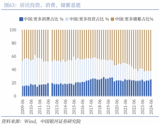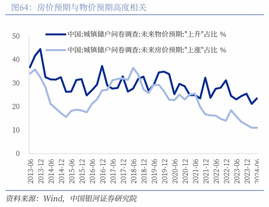 房地产价格下行,资产价格带来通胀预期走低,进一步降低了居民投资、消费意愿。资产价格与通胀预期有较强关联,中国居民资产主要配置在房产,房地产价格下行会带来通胀预期走低。央行城镇储户问卷调查显示,未来房价预期与物价预期有较强的相关性。而通胀预期的走低会进一步影响居民的投资和消费意愿,形成向下螺旋,更多消费和投资的占比自2020年开始下行,而更多储蓄的占比则明显提升。