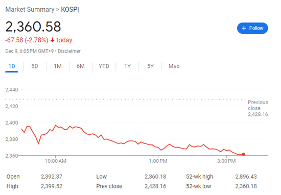 受政坛动荡冲击,周一韩国股汇双杀。韩国综指收跌2.78%,报2360.58点,创下一年多以来最差表现。