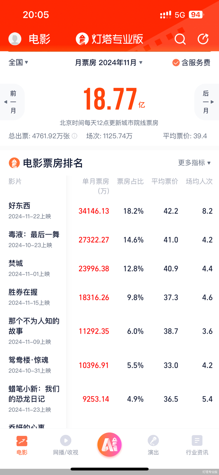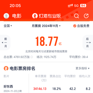 11月电影全国总票房18.77亿元,电影《好东西》5.49亿元领跑