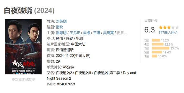 豆瓣上,六万多人对《白夜破晓》(下称“《白夜2》”),给出了6.5的分数,其中不乏网友各种的批判:“推理魅力下降”“泯然众人矣”“剧情注水”。