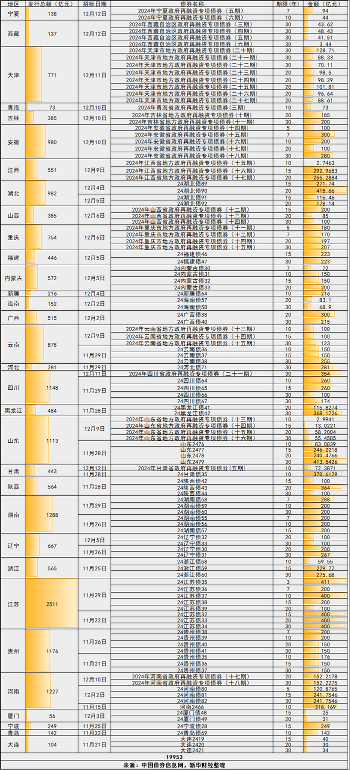 新华财经还注意到,截至12月8日,部分地区已经开始公布2024-2026年总体隐债置换专项债计划,其中新疆和贵州已经通过预算调整方案公布了相关额度,分别是638亿元和1176亿元。市场人士预计称,后续各省最晚会在明年1月地方两会召开期间公布三年置换总额度,置换节奏也将逐渐明朗。