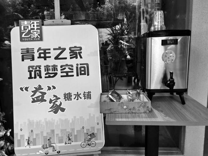 在咖啡店外,还设置了“益家”糖水铺,每周为快递小哥等户外工作者送出100份时令饮品。