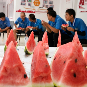 8月6日,快递小哥在河北省承德市宽城满族自治县缸窑沟社区服务站吃西瓜。新华社发(刘满仓摄)