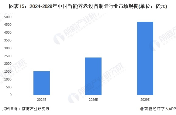 随着5G技术不断成熟,在物联网、大数据、云计算、人工智能等前沿技术的助力下,结合未来我国人口老龄化的趋势,前瞻预测未来一段时间内智能养老设备制造行业市场规模将持续增长,预期2029年将突破4700亿元,年均复合增速为25%。