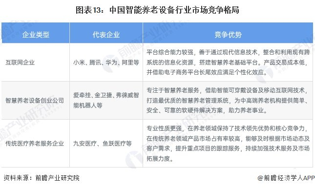 整体来看,互联网巨头在客户流量方面有较大优势,并且依托自身的信息和数据资源,搭建了综合性的智慧养老基础平台;创业公司则是专注于智慧养老服务,业务单一且更加深入;传统机构在传统领域产品市场上则占有较高的市场份额,客户品牌认可度更高。
