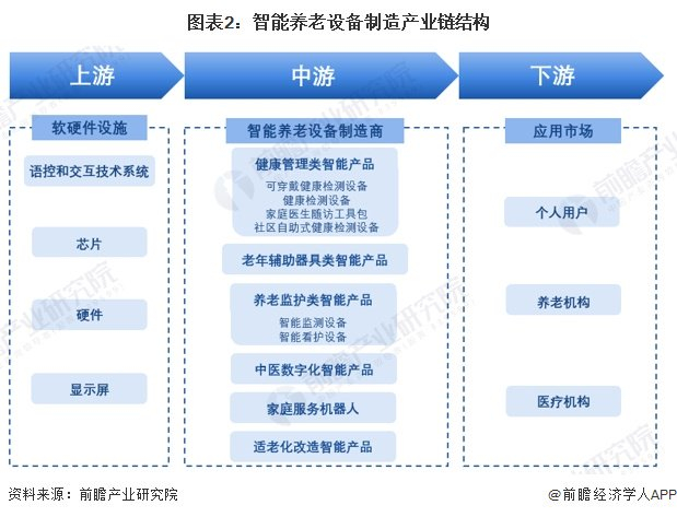 智能养老设备制造行业产业链上游为制造设备所需要的软硬件设施,其中硬件设施包括芯片、传感器、电池等,软件则包括交互技术系统、数据平台系统等;行业的中游为智能养老设备制造商,按照不同细分产品可以划分为不同的设备制造商;行业下游则为智能养老设备需求用户,包括个人用户和机构用户,其中机构用户有养老机构和医疗机构。