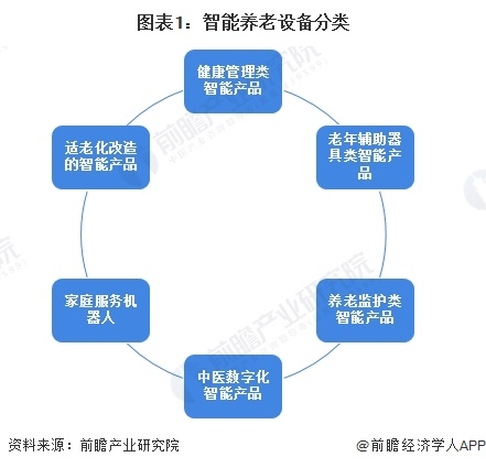 根据工业和信息化部、民政部和国家卫生健康委员会的定义,智能养老设备是紧密结合信息技术,具备显著智能化、网络化特征和健康养老服务功能的新型智能终端产品,主要包括具有趋势分析、智能预警等功能的健康管理类智能产品;功能代偿型等老年辅助器具类智能产品;具有行为监护、安全看护等功能的养老监护类智能产品;具有健康状态辨识、中医诊断治疗等功能的中医数字化智能产品;围绕助老助残、家庭生活需求的家庭服务机器人;实施适老化改造的智能产品六大类。