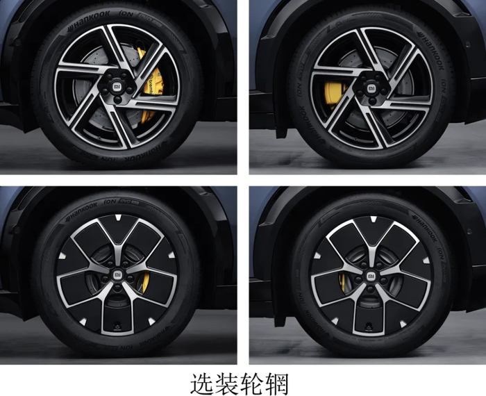 其他的一些设计细节的差异,除了上文提到的后尾灯设计样式稍有调整外,小米 YU7 目前展示的两套轮毂中,其中有一套为全新设计,以旋转对称的线条为核心设计样式。