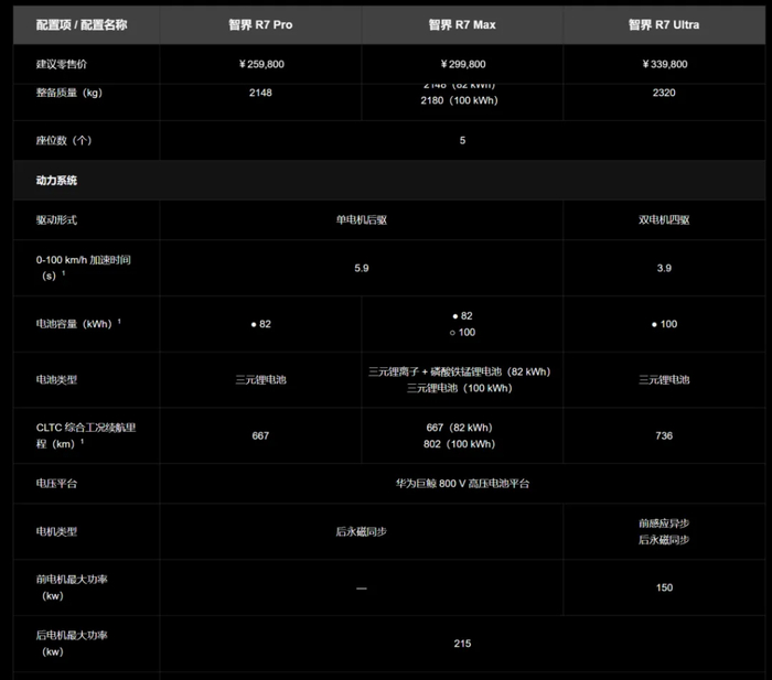 至于电气性能,智界 R7 给出的参数为全系 800V 架构,搭载 100kWh 电池包的版本续航可达 802km(CLTC 工况),而续航里程最短的版本,也能提供 667km 的 CLTC 工况续航。