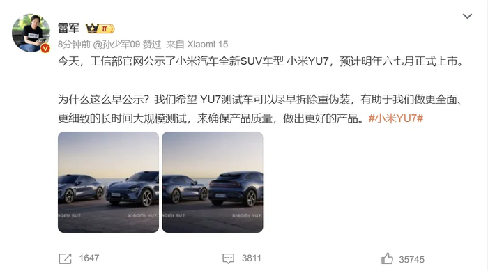 在工信部「证件照」公布后不久,小米创始人雷军在社交平台上发文,为小米 YU7 的初亮相做了补充说明。