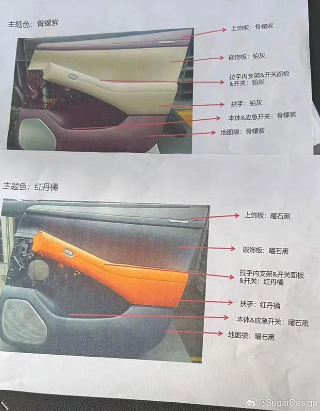 另外,从曝光样件材质对照图来看,小米 YU7 的内饰至少会有骨螺紫和红丹橘两种配色,不妨来看看拉面师傅的效果图。