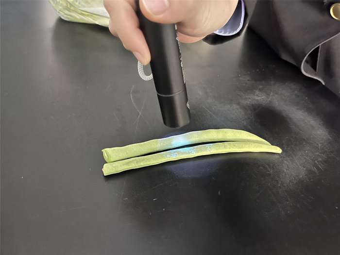 首先,使用紫光灯对市场上购买的蔬菜进行照射。结果显示,一部分蔬菜出现了荧光反应,而另一部分则没有变化。
