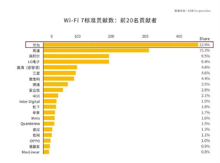 而托尼如此期待 Wi-Fi 8 的原因,除了 “ 填坑 ” 属性的特性之外,是看到联发科其实并不是拥有 Wi-Fi 专利最多的机构,排他前面的很多老大哥,像华为高通,还没发力呢。