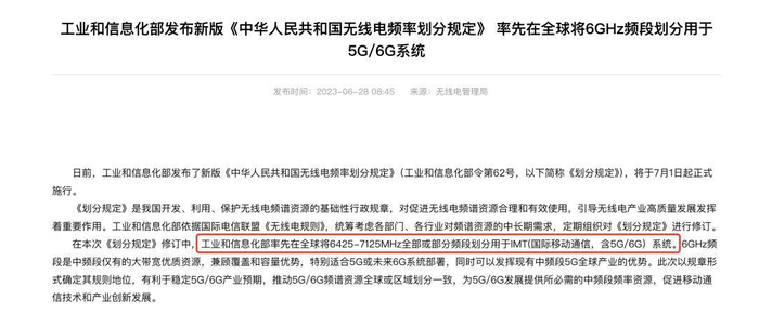 首先是我国工信部在 2023 年 6 月,就把 Wi-Fi 7 新增的 6GHz 频段中的 6425-7125MHz 频段资源,分配给了移动网络—— 5G 和未来的 6G 。