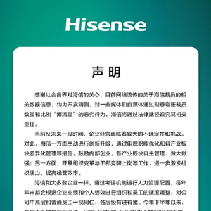 在声明末尾,海信表示,“以海信为代表的中国制造业,需要并期待广大媒体和公众一如既往地理解与支持。”