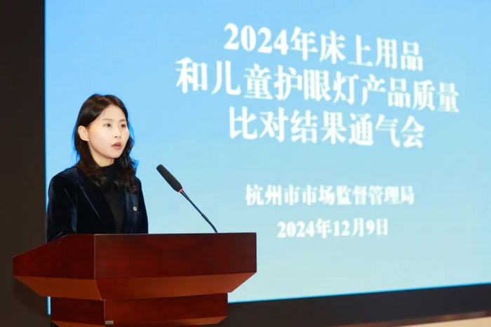 为让百姓购买到放心安全的产品,12月9日,杭州市市场监督管理局召开全市2024年床上用品和儿童护眼灯两种产品质量比对情况通气会,向社会公布质量比对结果。选取在杭州市生产或销售、与老百姓生活贴近的两种产品——床上用品和儿童护眼灯,比对历时6个多月,共检测55批次产品。活动由市局党委委员、副局长余梅芳发布质量比对结果,2名专家分别作结果解读,市质科院、宣传应急处主要负责人及媒体代表和企业代表等100余人参加。