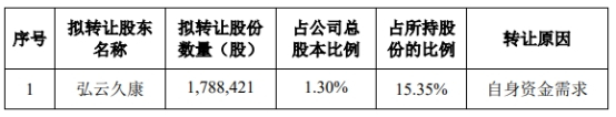 本次询价转让股份的数量为1,788,421股,占嘉和美康总股本的比例为1.30%,转让原因为自身资金需求。