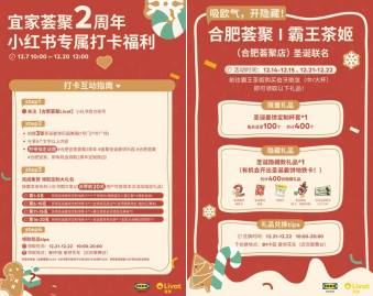 为了感谢合肥市民两年的陪伴与成长,12月6日-12月22日,合肥宜家陆续开启打卡领取限定好礼,小红书新粮仓站合肥荟聚站趣味打卡、小红书集赞打卡、霸王茶姬联名打卡,有机会领取姜饼人地铁卡、美食霸王餐、宜家新品周边、奶茶券、隐藏周边等心动好礼。