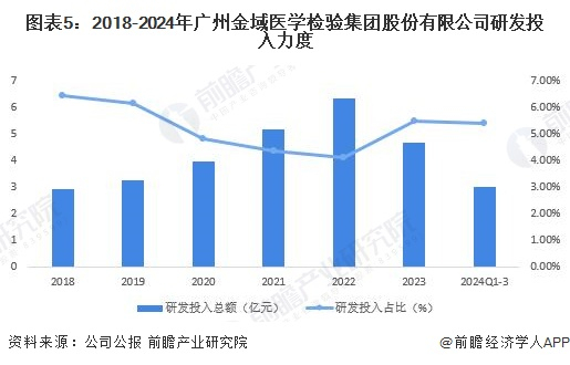金域医学以技术创新为核心驱动力,持续保持高研发投入以加强疾病诊断等医学诊断服务能力,2018-2022年,公司研发投入总额持续增长,研发投入占营业收入比重波动变化;2023年研发投入有所下降,研发投入占比增长至5.5%;截至2024年上半年,公司已拥有11大类87类检验技术,技术门类齐全性达到国际先进水平。
