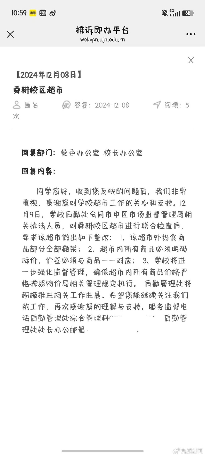 党委办公室、校长办公室回应称,12月9日,学校后勤处会同市中区市场监督管理局相关执法人员,对舜耕校区超市进行联合检查后,要求该超市做出如下整改:1、该超市外热食商品部分全部撤架;2、超市内所有商品必须明码标价,价签必须与商品一一对应;3、学校将进一步强化监督管理,确保超市内所有商品价格严格按照物价局相关管理规定执行。后勤管理处将积极推进相关工作进展。