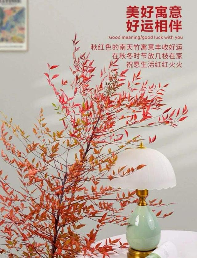 记者在某平台上网购了两支南天竹,在商品介绍里,主打的就是“秋色红叶”“绿橙红黄多色”,还配以十分文艺的图文推荐——“秋红色的南天竹寓意丰收好运,在秋冬时节放几支在家,祝愿生活红红火火。”极具美感的照片和寓意很好的介绍,让人忍不住下单。