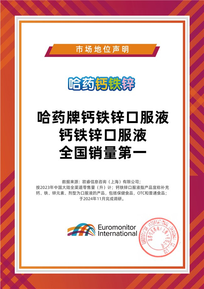 近期,哈药牌钙铁锌口服液凭借其卓越的市场表现,在2023年度中国大陆地区全渠道零售销量(以升为单位统计)中脱颖而出,荣登全国销量第一。这一权威数据由国际知名市场研究机构——欧睿信息咨询(上海)有限公司经过深入调研后隆重发布。这一殊荣不仅彰显出哈药牌钙铁锌口服液凭借其出色的品质赢得了市场的广泛认可,更是对哈药集团在健康产品领域深耕细作、持续创新的最佳注解。