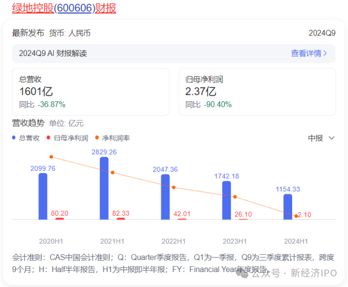 新经济IPO注意到,绿地控股虽未披露旗下金融业务财务数据,但披露了合营企业——绿信集团的财务数据。绿地控股2024年半年度报告显示,绿信集团为绿地控股合营企业,持股比例为持股50%,业务性质为互联网。报告期内,绿信集团实现营业收入1.04亿元,同比增长42.09%;实现净利润-2179.13万元,上年同期亏损316.06万元。