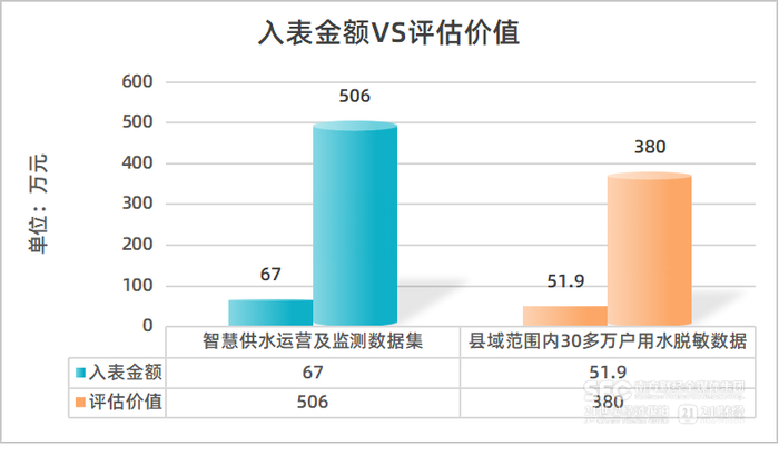 南财数据团队梳理发现,在上述数据资产入表落地案例中,披露的入表金额较大程度低于其评估价值。如山东惠商水务发展集团有限公司完成“智慧供水运营及监测数据集”的数据资源登记及入表工作,评估价值为506万元,入表金额为67万元;庐江县康江建设投资有限公司完成30多万户用水脱敏数据资产入表,评估价值为380万元,入表金额为51.9万元,基本相差7-8倍左右。