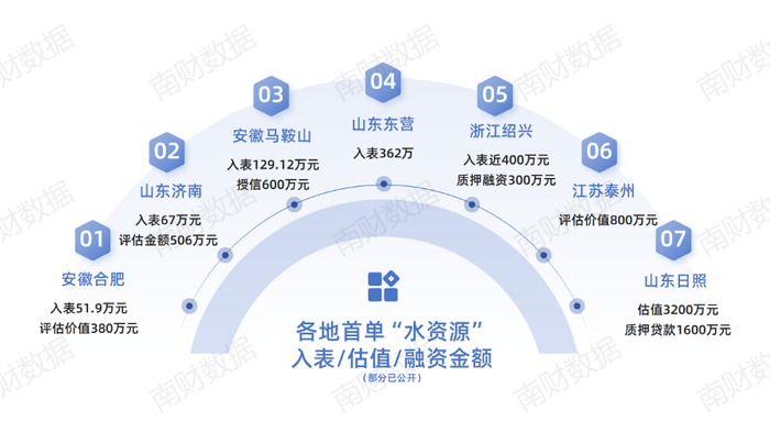 今年以来,多地水务系统宣布完成首单1000倍数据资产的登记和入表工作。南财数据团队对全国范围内的水务数据资产入表及融资案例进行统计和梳理,分析发现至少有十省(市)落地“首单”,入表金额从50万元到400万元不等,估值金额从300万元至3000万元不等,融资金额从500万元到1600万元不等。其中,区县级水务单位对入表更为积极,如安徽庐江县和含山县探索“水资源”变“水资产”,总金额超过180万元。