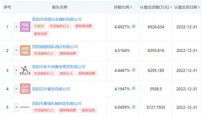 伊川农商行股权非常分散,最大的股东洛阳市鸿瑞冶金辅料有限公司也仅持股4.9%,而且前五大股东,已经有4个成了失信被执行人。