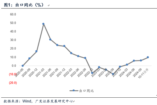 11月出口在基数显著抬升的背景下依然取得同比6.7%的增速。今年前三个季度出口同比分别1.1%、5.6%、6.0%,10-11月合并增速进一步提升至9.6%。前11个月出口累计同比为5.3%。