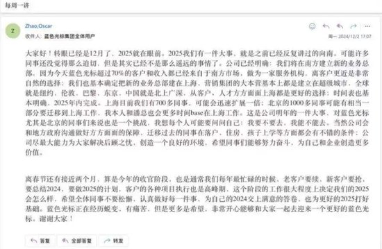 据网传的蓝色光标内部全员信,创始人赵文权宣布,公司已经明确,将在南方建立新的业务总部,基本确定新业务总部是上海,并将在2025年内完成。