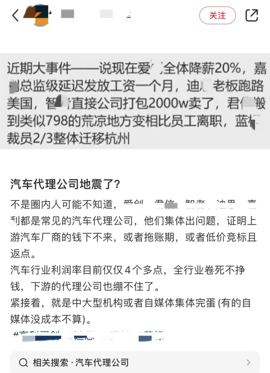 前不久,网上还传出一则“汽车代理公司地震”的小道消息,其中还提到了几家公关公司的消息:比如蓝色光标疑似要“南迁” 。