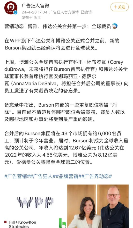 今年年初,WPP旗下的伟达公关和博雅公关正式合并的第一步,就是进行全球裁员。