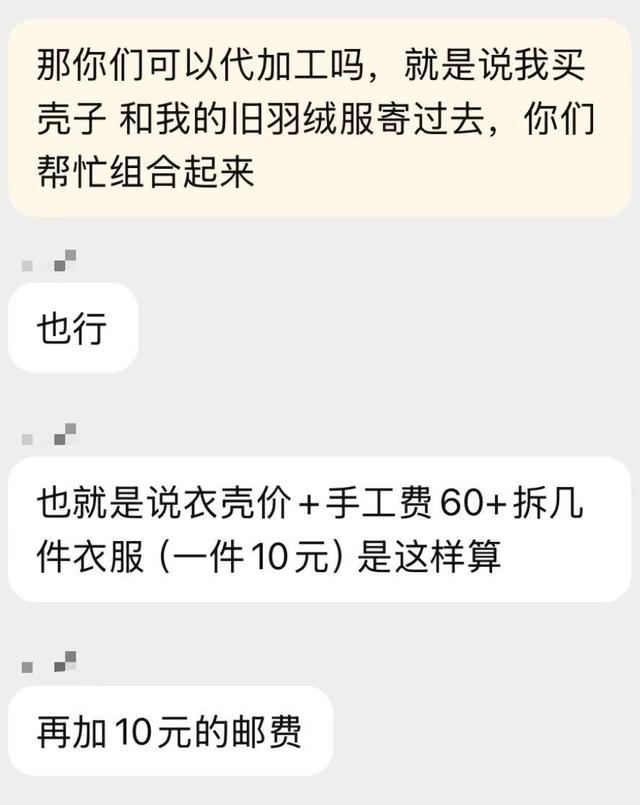 在线上进行翻新羽绒服,顾客甚至可以自行选购“套壳”。记者发现,部分消费者选择自行购买一个羽绒服壳子,和自己的旧羽绒服一起寄给线上的翻新店铺,或直接在翻新店铺充绒,由他们组装成一件新羽绒服,店家收费标准为“手工费(60元)+拆装费(10元/件)+邮寄费(10元)”。记者采访到一位在网上组装过羽绒服的消费者小李,她介绍自己购买了一件200元的衣壳,要做一件中长羽绒服,店家提供的是含绒量90%的白鸭绒,单价为65元/50克,“我这件衣服共充了200克鸭绒,算下来仅540元。对比线上的成衣,便宜了好几百元。”