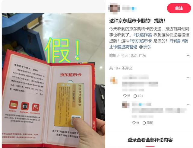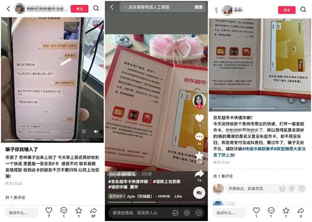 记者在抖音、微博、小红书等多个社交平台搜索相关信息发现,不止张女士一人收到了这类京东超市卡,广西、广东、湖北等多个省份的消费者晒出自己也收到了此类诈骗包裹,发货地为江苏南京、福建福州等多地。
