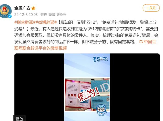 对此,记者从京东超市了解到,近期有诈骗分子以“京东双12促销”等名义向用户邮寄伪造的京东超市卡,通过赠送小礼品、红包等形式,诱导用户扫描卡片背面的二维码添加假冒的“京东客服”,之后逐步引导用户“刷单做任务”领取奖励,骗取客户资金。在此郑重提示,京东及京东超市从未组织此类活动,请大家切勿轻信,谨防受骗。