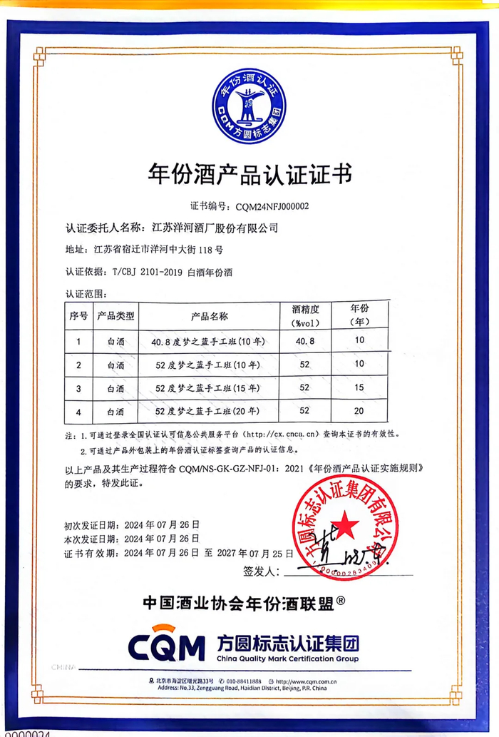 与此同时,梦之蓝手工班也成为首家获得中国酒业协会授权、由第三方认证机构——方圆标志认证集团有限公司认证的中国高端年份白酒。