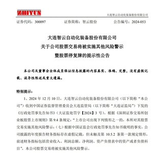 据披露,公司股票自2024年12月11日开市起停牌1天,并于2024年12月12日开市复牌起被实施其他风险警示,股票简称由“智云股份”变更为“ST智云”。