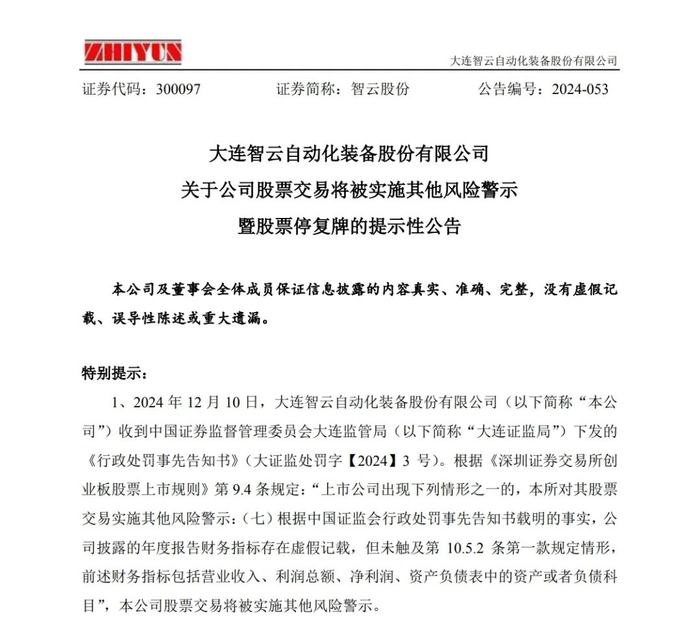 12月10日晚,智云股份公告称,公司于12月10日收到大连证监局下发的《行政处罚事先告知书》。因公司2022年年度报告存在虚假记载,股票交易将被实施其他风险警示。