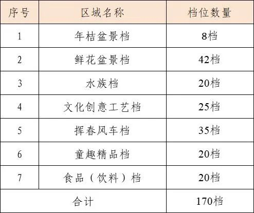 设有年桔盆景、鲜花盆景、水族、文化工艺、挥春风车、童趣精品及食品(饮料)档等档位共170个: